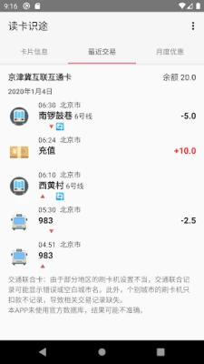 本应用拥有广泛的兼容性,覆盖全国主要城市交通卡。无论是北京市政交通一卡通(CPU卡)、京津冀互联互通卡、上海公共交通卡(紫卡),还是羊城通(CPU卡)、深圳通等,均在其支持列表。特别是带有"交通联合"标志的卡片,以及南京、苏州、天津等地的指定交通卡版本,均可轻松读取,助您跨城出行无忧。请留意,本工具暂不支持学生卡、老人卡等特殊卡种。需要强调的是,所有查询结果均源自非官方数据库,仅供用户参考,请以官方数据为准。
