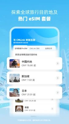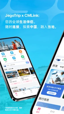 JegoTrip 携手 CMLink,构建起强大的全球通信网络,确保您无论置身异国他乡,都能畅快沟通,轻松连接中国与本地生活。通过 JegoTrip,您可以便捷浏览并即时启用覆盖中国、日本、韩国、新加坡等众多热门目的地的eSIM套餐,告别传统SIM卡的束缚。此外,JegoTrip 更是您管理 CMLink 账户的一站式平台,轻松查询余额、办理套餐及续订服务,一切尽在掌握。
